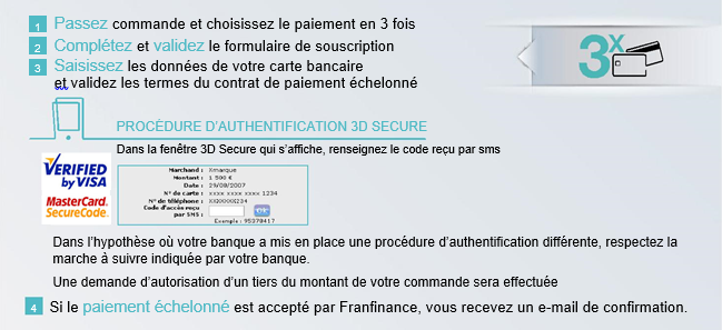 Le paiement en 3 fois par carte bancaire est une solution de paiement qui vous permet d’échelonner le règlement de votre commande en 3 échéances débitées sur votre compte associé à votre carte bancaire. Exemple : pour un achat de 600 €, vous réglez 3 échéances de 200 €. Montant total du financement : 600 €. Frais : 9 € (soit 1,5 % du montant du financement). Montant total dû : 609 €. Durée maximum du financement : 3 mois.